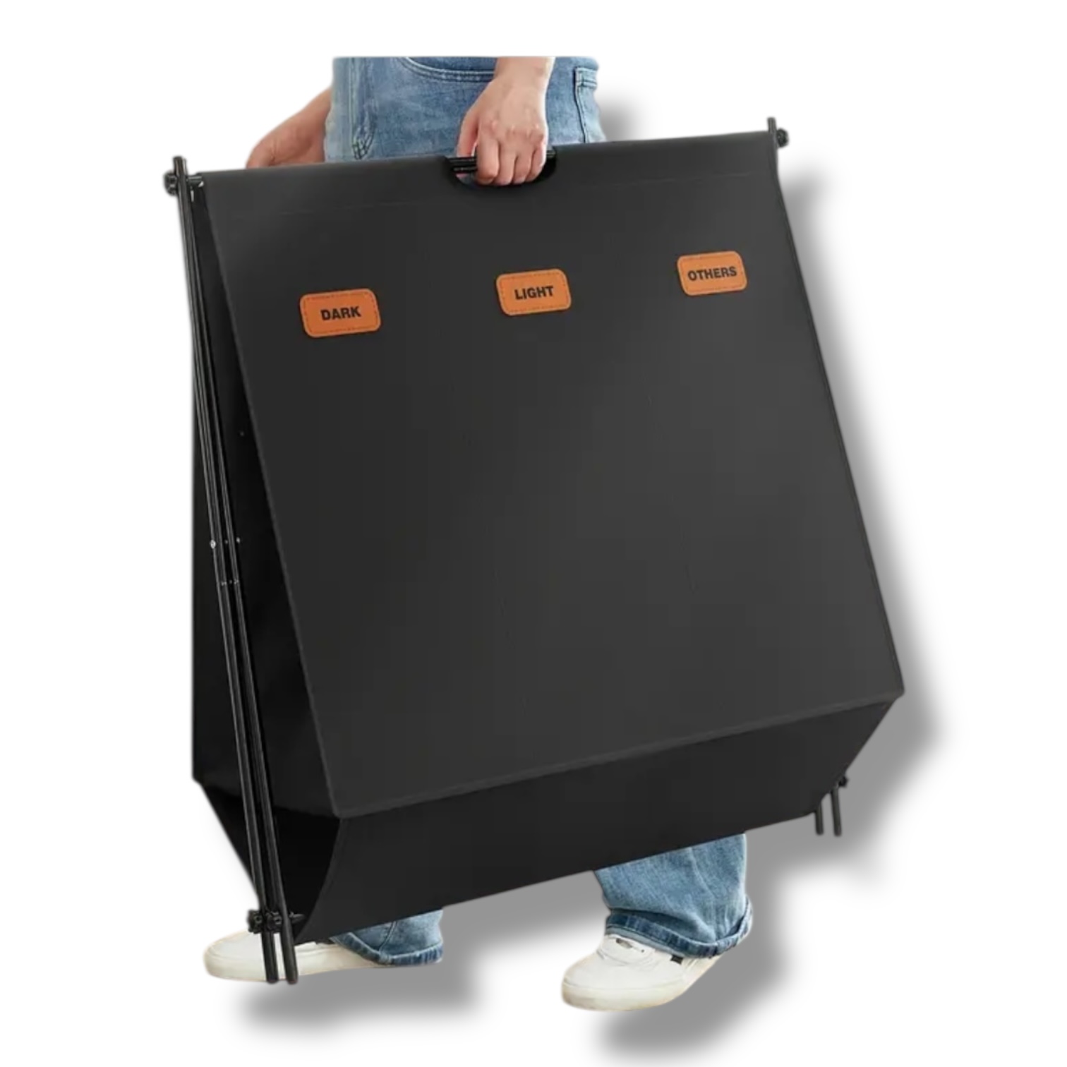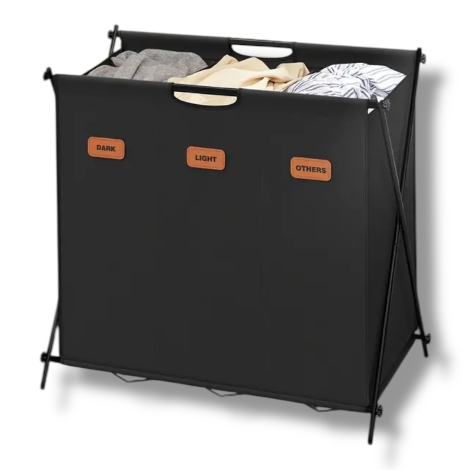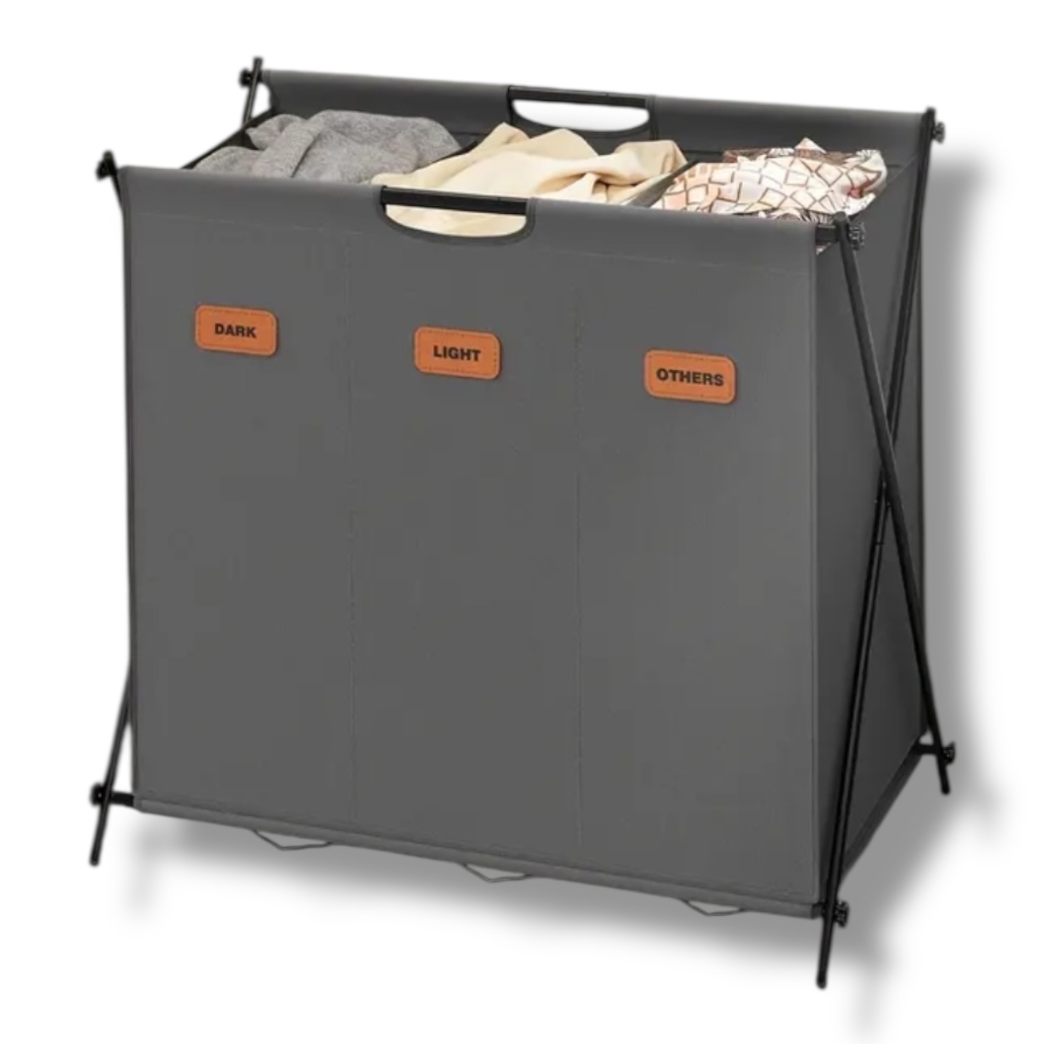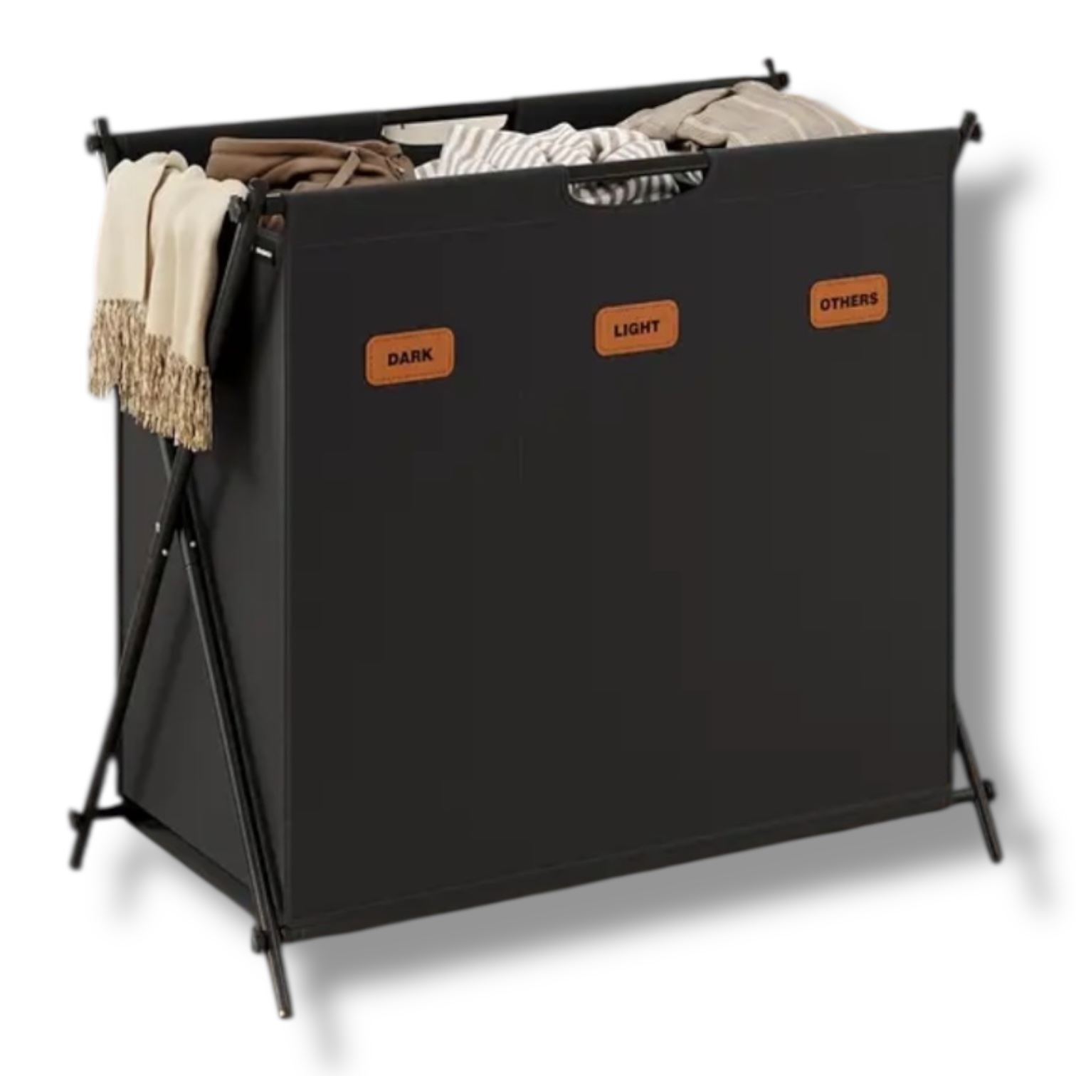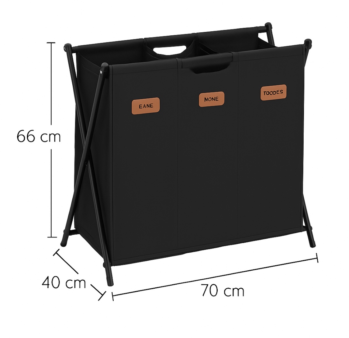 Priestranná triedička na bielizeň Anton s objemom 135 l a tromi oddeleniami na efektívne triedenie oblečenia. Skladací X-rám zabezpečuje stabilitu a jednoduché skladovanie, keď ju nepoužívate. Každá priehradka je vybavená prispôsobiteľnými štítkami pre lepšiu organizáciu.
