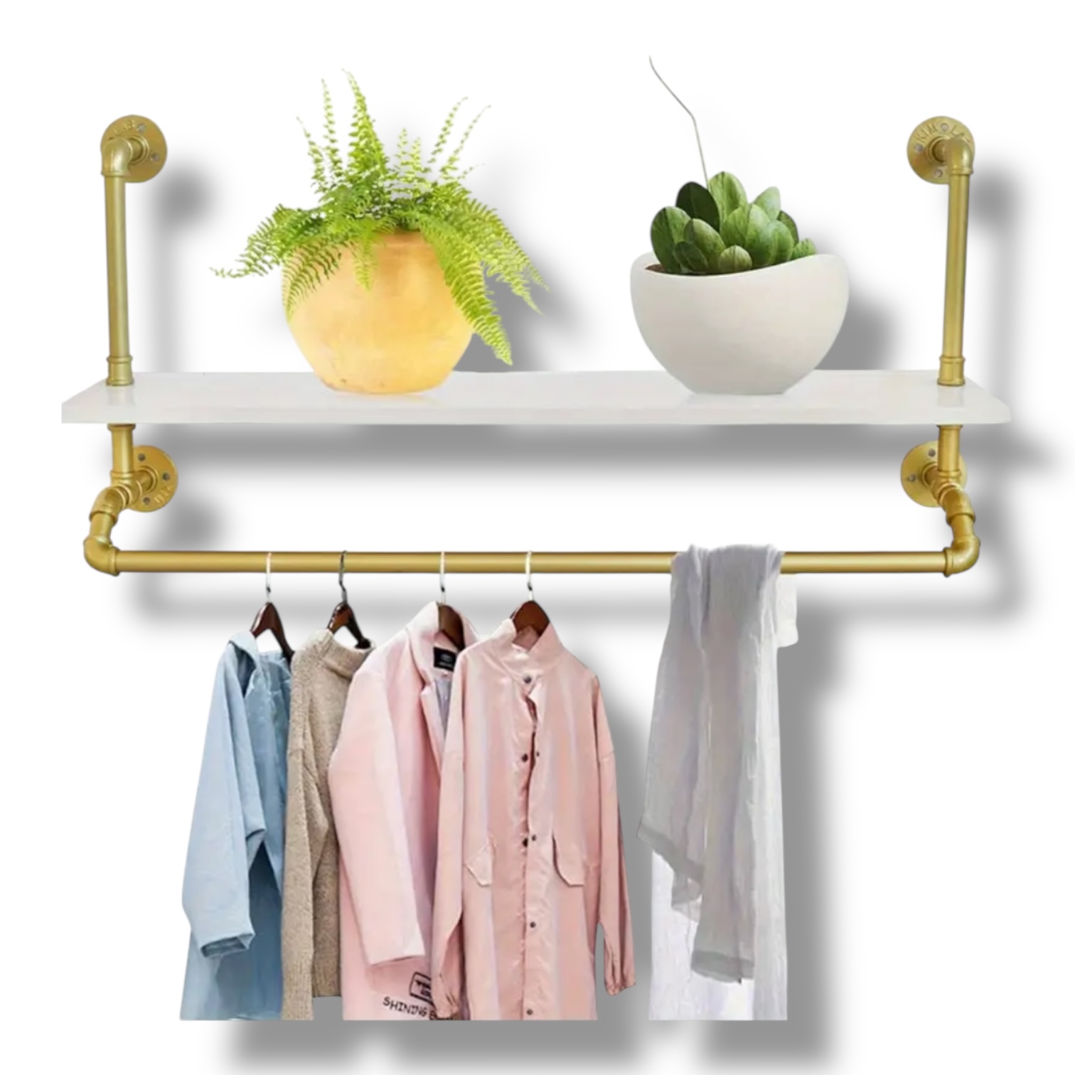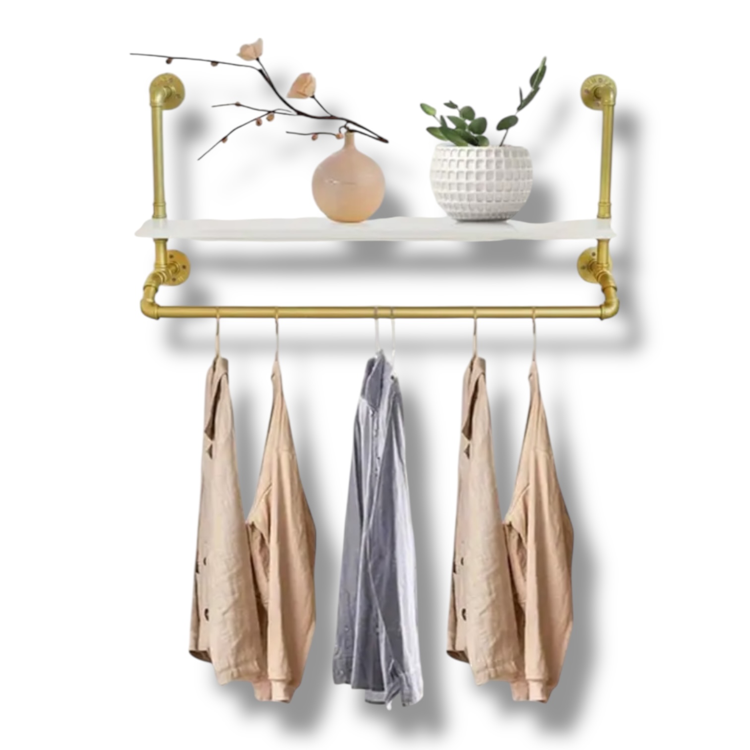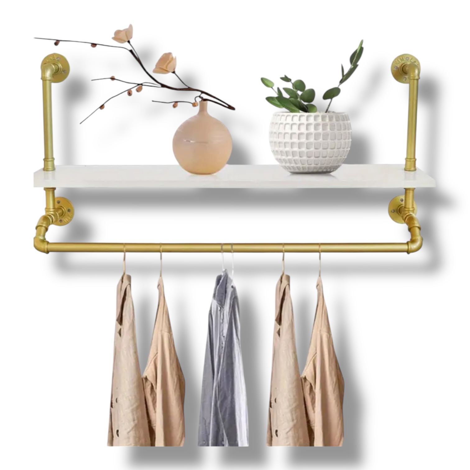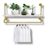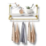 Máte chaos v oblečení? Tento nástenný vešiak so skladovacou poličkou vám pomôže získať poriadok a štýl. Vyrobený z pevnej železnej/zinkovej konštrukcie, ponúka výnimočnú nosnosť až 39,9 kg (tyče až 55,3 kg) a elegantný vzhľad v bielej a zlatej farbe. Je ideálny do vstupnej haly, spálne či kúpeľne – na kabáty, uteráky, doplnky aj sezónne oblečenie.