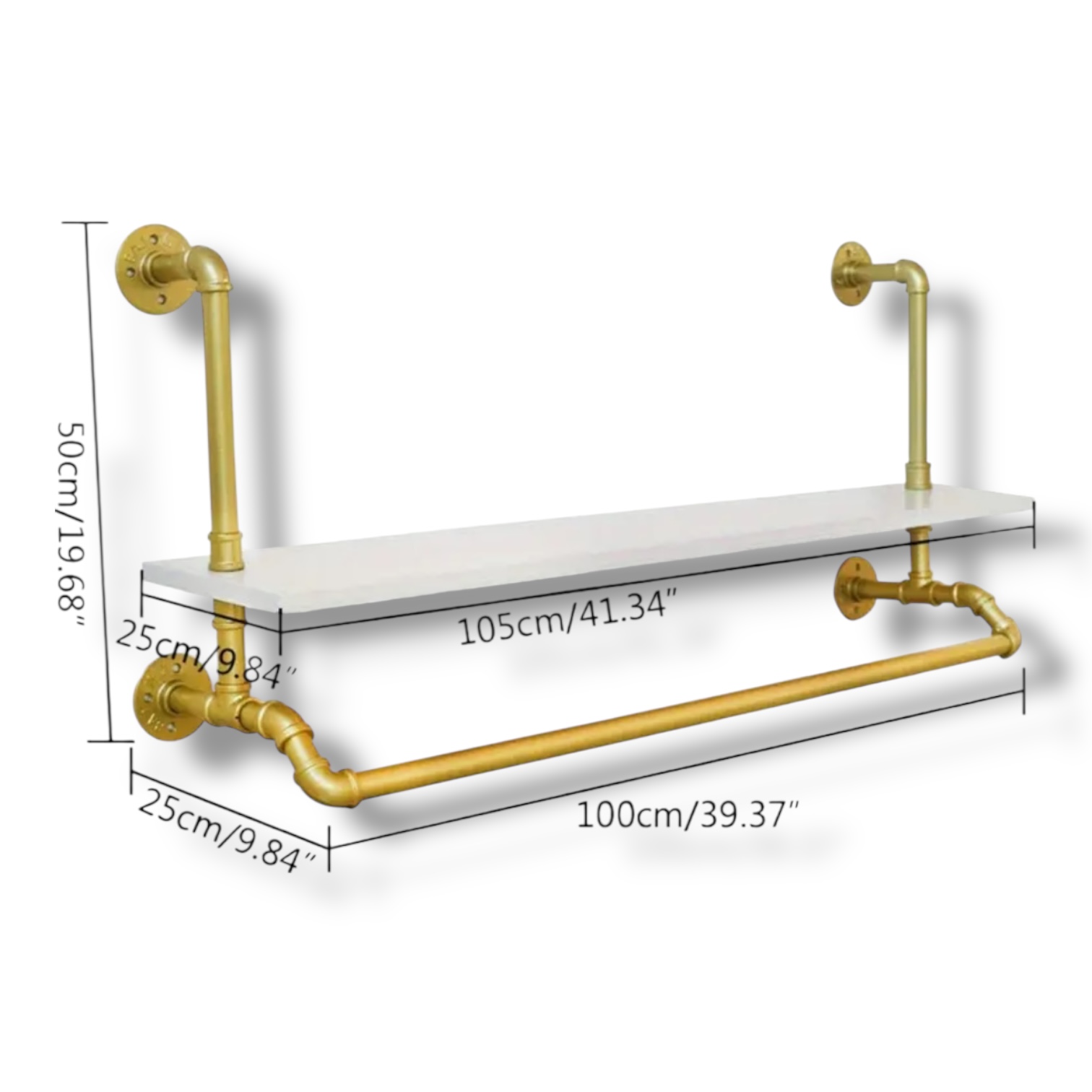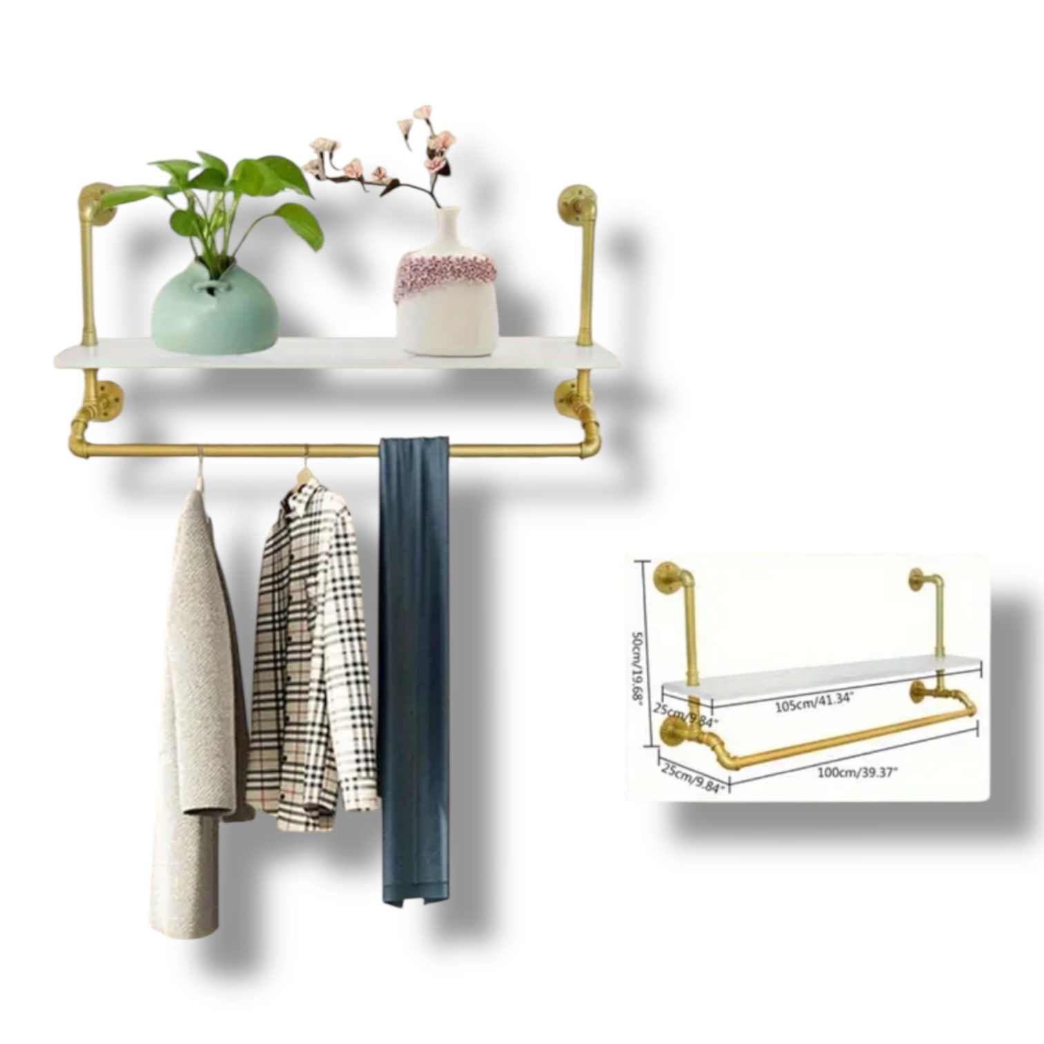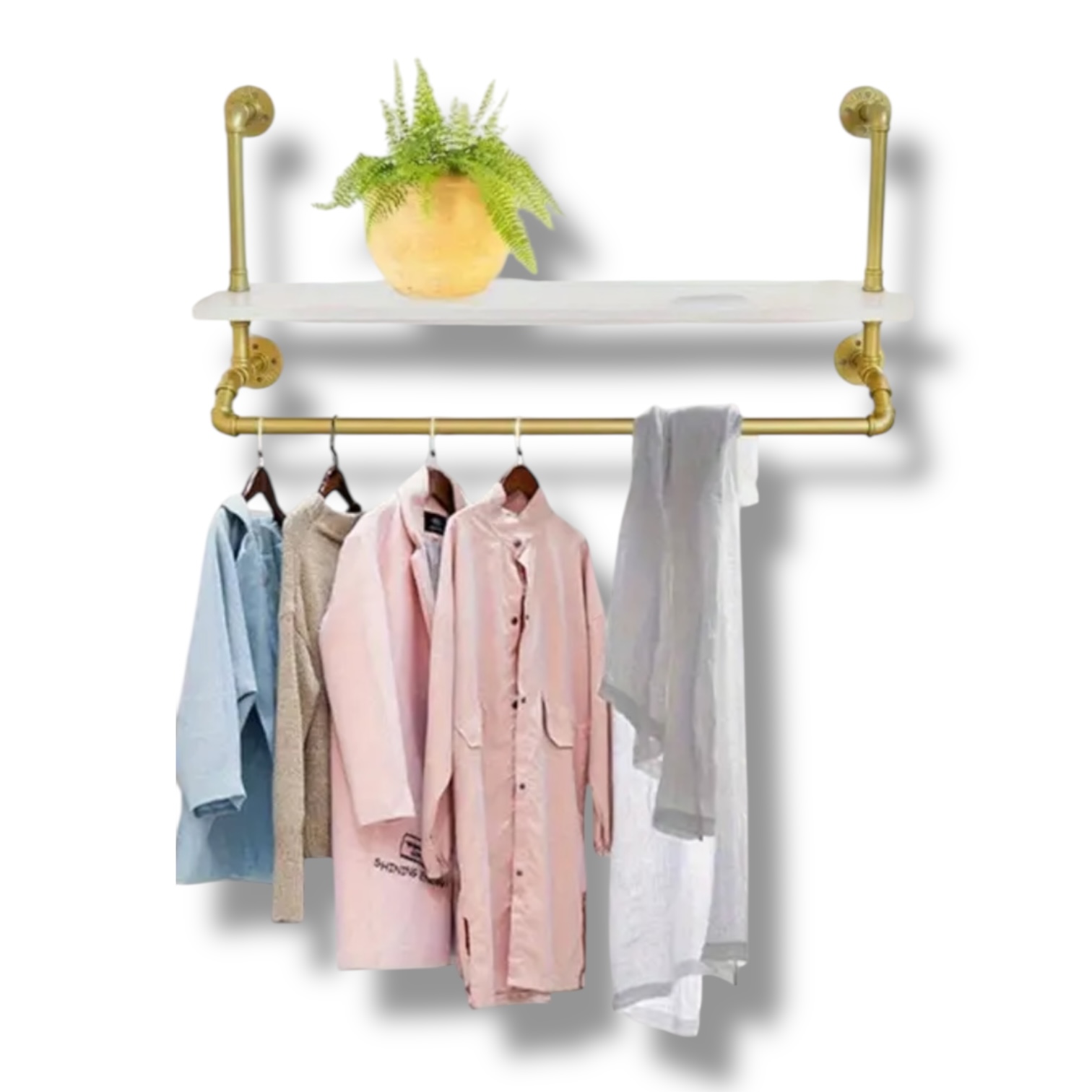 Máte chaos v oblečení? Tento nástenný vešiak so skladovacou poličkou vám pomôže získať poriadok a štýl. Vyrobený z pevnej železnej/zinkovej konštrukcie, ponúka výnimočnú nosnosť až 39,9 kg (tyče až 55,3 kg) a elegantný vzhľad v bielej a zlatej farbe. Je ideálny do vstupnej haly, spálne či kúpeľne – na kabáty, uteráky, doplnky aj sezónne oblečenie.