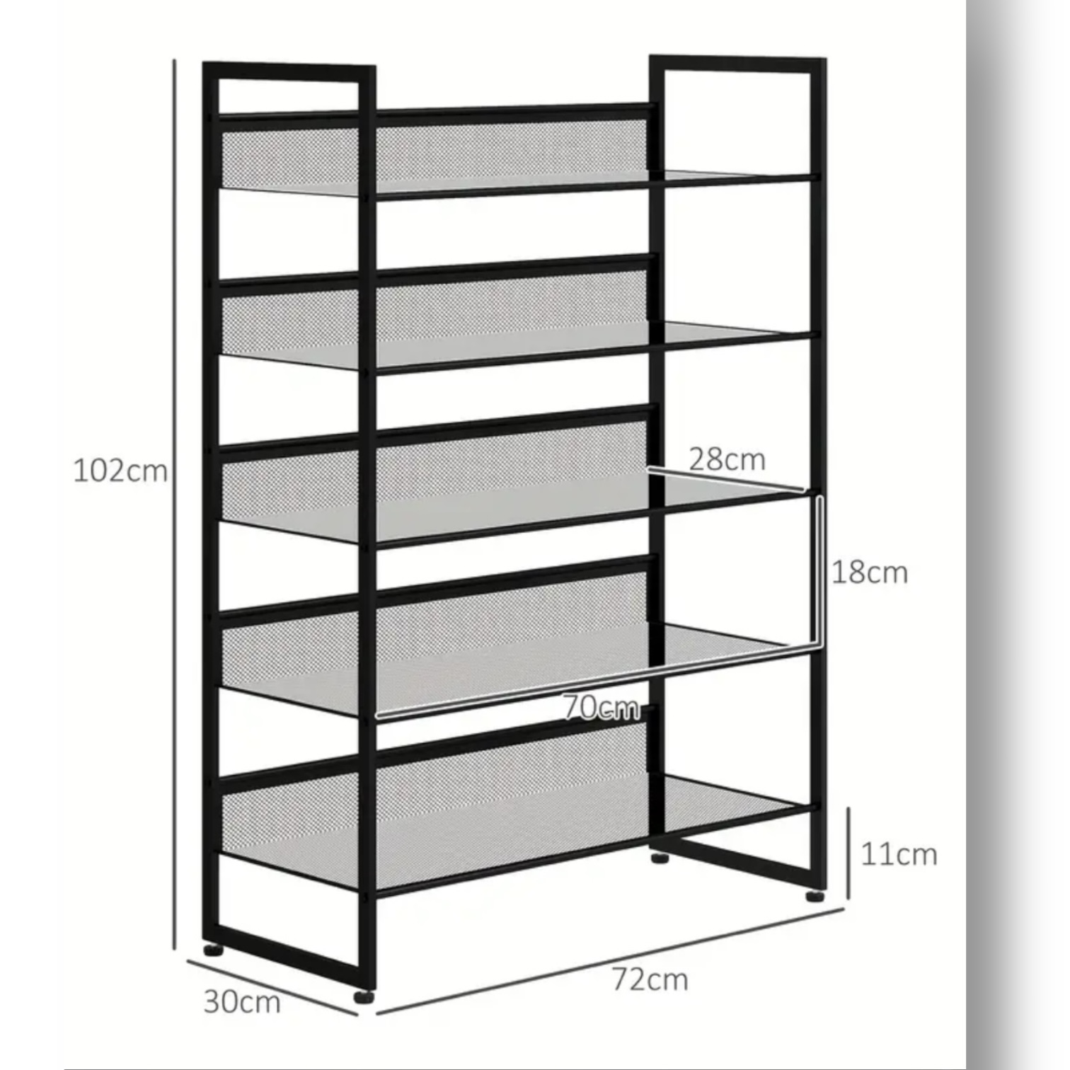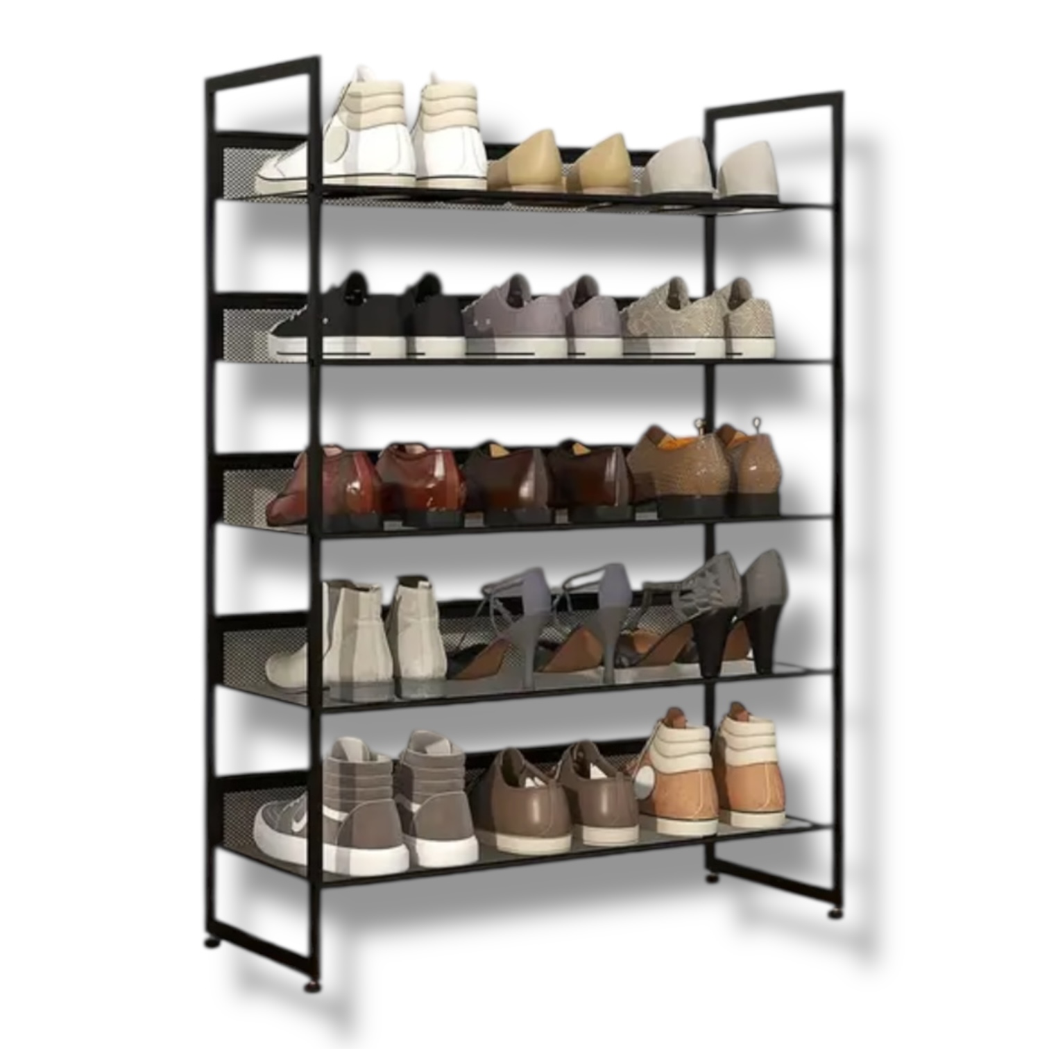 Robustná kovová konštrukcia v čiernej farbe zaručuje stabilitu, dlhú životnosť a jednoduchú údržbu. Každá polica poskytuje dostatok miesta na obuv pre celú rodinu – od tenisiek po papuče.